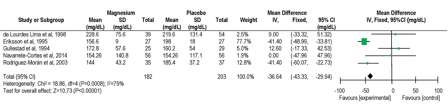 Figure 2. Weighted mean difference and forrest plot of FBS levels in magnesium-treated and placebo groups.