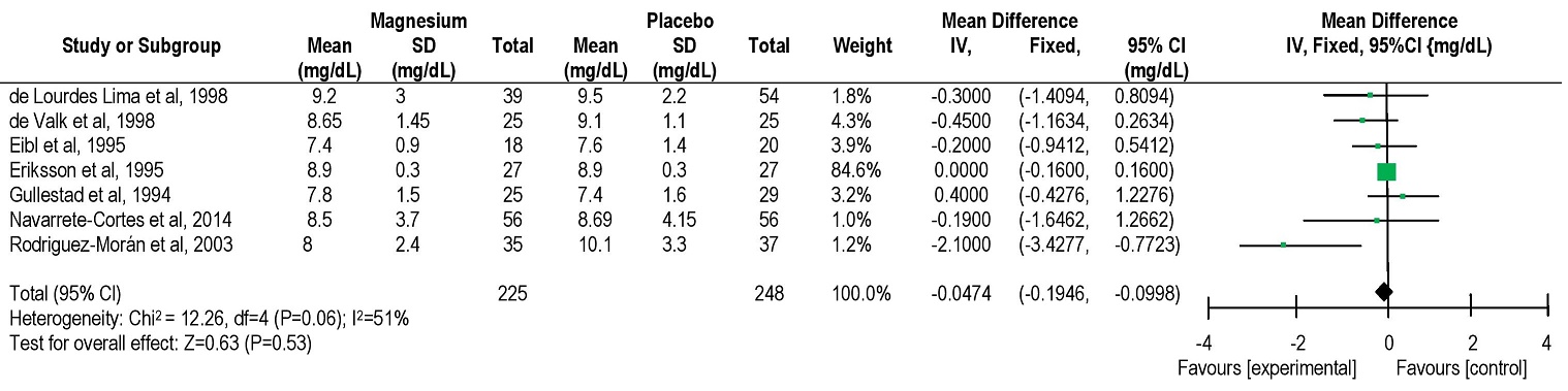 Results. Of the 689 records screened, 10 studies were included in the qualitative synthesis and 7 studies in the meta-analysis. Pooled data showed a non-significant trend towards improvement in glycemic control in the magnesium-treated group (mean difference -0.19, CI -0.58 to 0.21). There was a stronger but still non-significant trend in T2DM patients with hypomagnesemia (mean difference -1.16, CI -2.92 to 0.6).