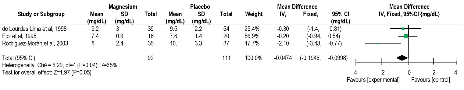 Figure 5. Weighted mean difference in HbA1c of magnesium-treated and placebo groups, analyzed without the study with severe hypomagnesemia (Rodriguez-Morán, 2003[30]).