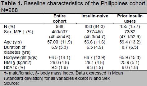 A summary of patient demographics at baseline is presented in Table 1. Of the total 988 patients on IDet included in the subgroup analysis of Philippines cohort, 833 patients were insulin therapy naive (84.3%) and 155 patients (15.7%) were on prior insulin therapy. Female participants constituted 54.6 % of the entire cohort. The participants were 56.6 ± 11.6 years and 59.4 ± 13.2 years of age in insulin-naive and prior insulin user groups respectively. Majority of the patients already had established diabetes during the time of enrolment and the duration of diabetes in the insulin therapy naive group was 6.5 ± 4.9 years while it was 8.7 ± 6.5 years in those on prior insulin therapy. Body mass index (BMI) was comparable in both the groups (26.1 vs 25.9 kg/m 2). The baseline HbA1c levels were also similar in insulin-naive patients at 9.3 ± 1.9% and prior insulin users at 9.0 ± 1.8%. The PPPG (13.5 vs 13.7 mmol/l) and FPG (11.5 vs 10.6 mmol/l) values were also comparable (Table 1 and Table 2).