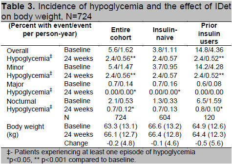 Table 3. Incidence of hypoglycemia and the effect of IDet on body weight, N=724