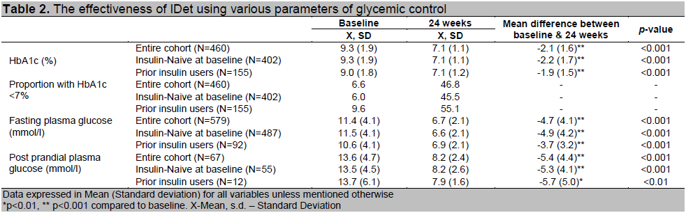 Results. At baseline the mean age, duration of diabetes and mean BMI were found to be 57±11.9 yrs, 6.9±5.3 yrs and 26±4.8 kg/m2 respectively. Majority of subjects were insulin-naive (84.3%) and glycemic control was poor in all the groups at baseline. At the end of 24 weeks, there were significant improvements following IDet initiation with a 2.1% reduction in mean HbA1c. The HbA1c target of <7% was achieved by 46.8% subjects at the study end. Although not statistically significant, there was a modest decrease in body weight in all the groups. There was no increase in the incidence of hypoglycemia among baseline insulin-naive subjects, while a significant reduction in hypoglycemia was seen among prior insulin users.