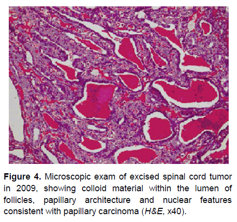 Although a metastatic papillary thyroid cancer was initially considered, the migration of papillary carcinoma from a primary thyroid to distant sites bypassing cervical lymph nodes is unusual. Also, a review of the post-thyroidectomy histopathology did not reveal malignancy in the thyroid, leading us to conclude that the tumor excised from the patient’s spinal cord was ectopic thyroid tissue that transformed into papillary carcinoma. The postoperative whole body scan that was negative for iodine avid lesions outside the thyroid bed may reflect either complete resection of tumor in the spinal cord or poor iodine avidity. She did not receive high dose radioiodine ablation, and was given a suppressive levothyroxine dose at 100 mcg daily to prevent recurrence.