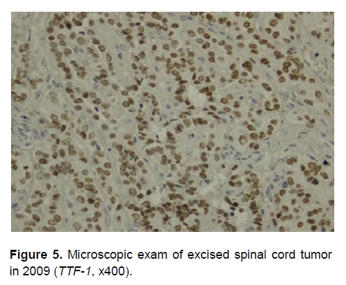 Figure 5. Microscopic exam of excised spinal cord tumor in 2009 (TTF-1, x400).