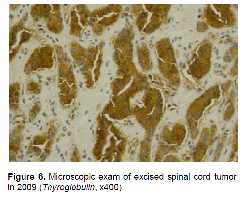 Figure 6. Microscopic exam of excised spinal cord tumor in 2009 (Thyroglobulin, x400).