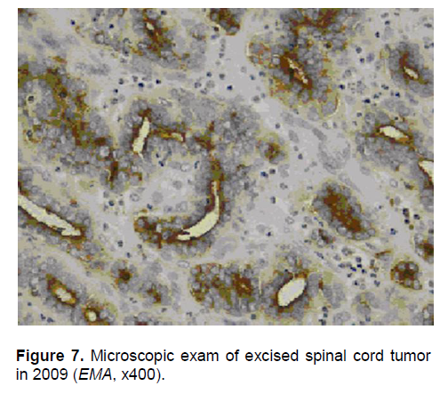 Figure 7. Microscopic exam of excised spinal cord tumor in 2009 (EMA, x400).