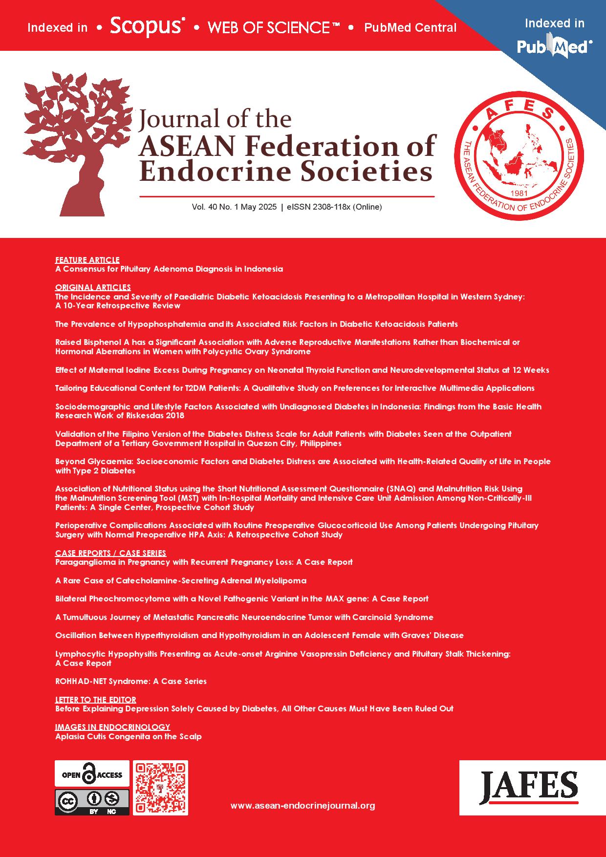 To request permission to translate, reproduce, download, or use articles or images for commercial reuse or business purposes from the Journal of the ASEAN Federation of Endocrine Societies (JAFES), kindly complete the Permission Request for Use of Copyrighted Material Form and email jafes@asia.com or jafes.editor@gmail.com.