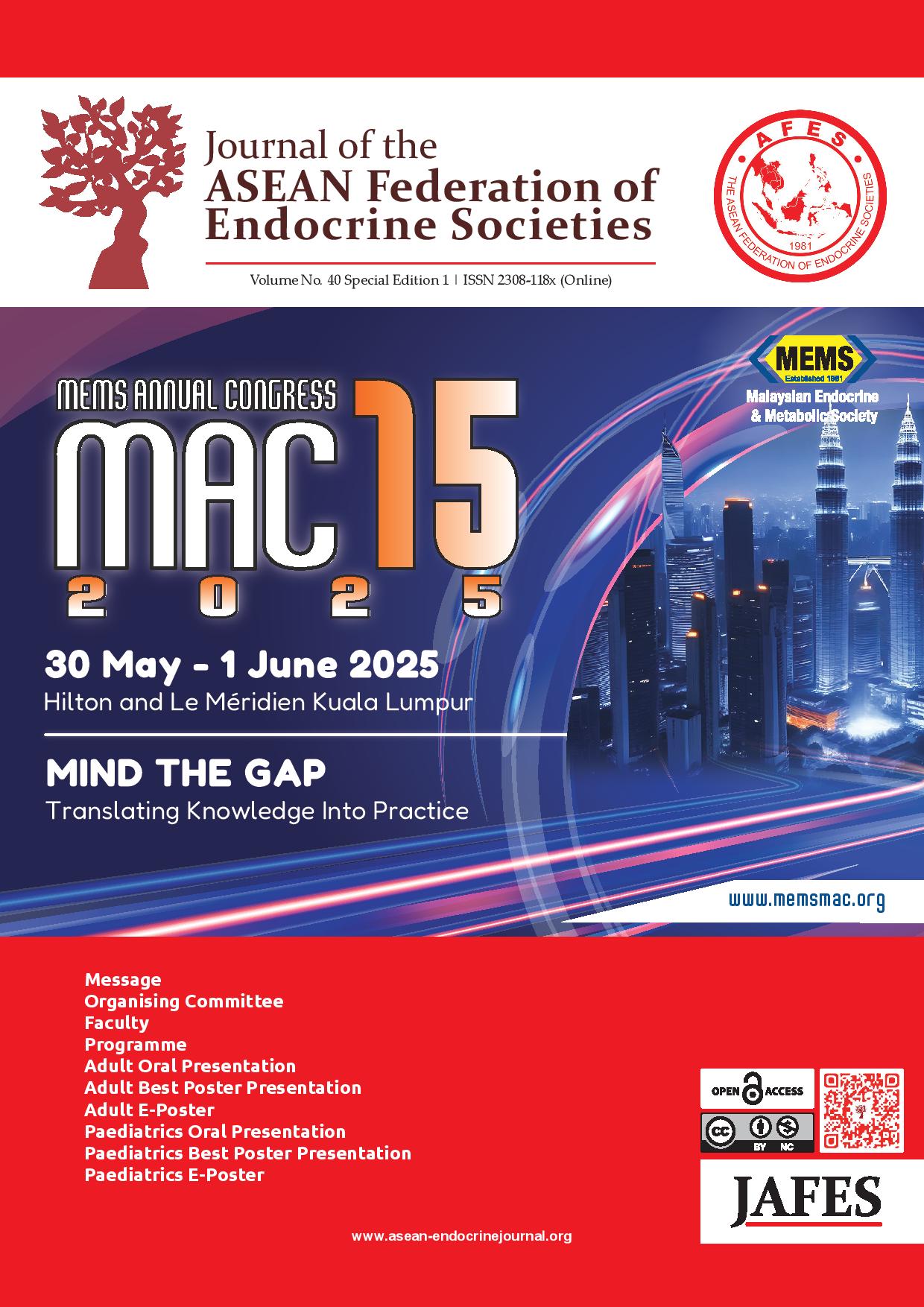 To request permission to translate, reproduce, download, or use articles or images for commercial reuse or business purposes from the Journal of the ASEAN Federation of Endocrine Societies (JAFES), kindly complete the Permission Request for Use of Copyrighted Material Form and email jafes@asia.com or jafes.editor@gmail.com.