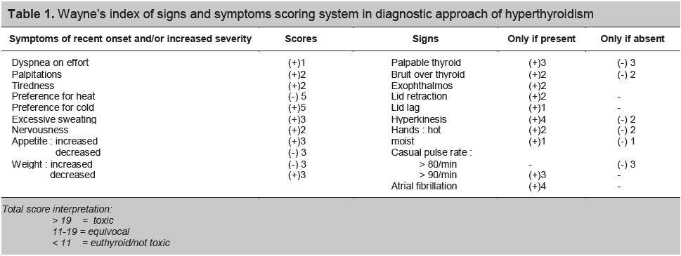 Table 1 . Wayne’s index of signs and symptoms scoring system in diagnostic approach of hyperthyroidism