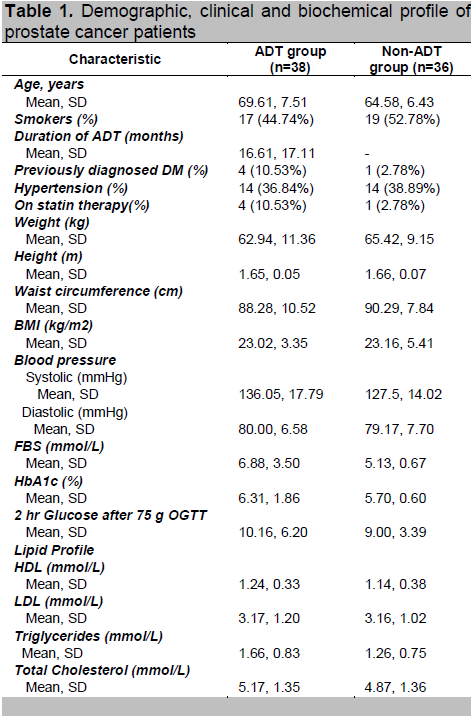 Seventy-four patients were included in the study: 38 were classified as belonging to the ADT group while the 36 patients were identified for the non-ADT group.