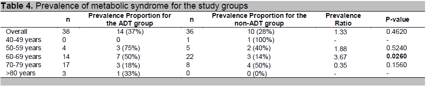 The probability of having metabolic syndrome is 1.33 times higher among prostate cancer patients belonging to the ADT group than prostate cancer patients belonging to the non-ADT group (p-value: 0.4620). Specifically for the 60-69 age group, the prevalence ratio is highest at 3.67 which means that the risk of having metabolic syndrome is 3.67 times higher for patients belonging to the ADT group than patients in the non-ADT group. (p-value: 0.0260)
