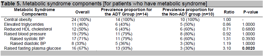 For patients with metabolic syndrome, the breakdown of each component is in Table 5. Elevated blood sugar is the most common component of the metabolic syndrome followed by elevated blood pressure among the ADT group. Comparing the ADT and non-ADT groups, the prevalence proportions are comparable except for high fasting plasma glucose (p-value: 0.0020). The probability of having high plasma glucose is 3.10 times greater among the ADT group than in the non-ADT group for patients with metabolic syndrome.