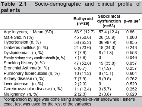 Cardiovascular risk factors and comorbidities did not statistically differ between euthyroid and subclinical thyroid dysfunction, except for family history of early cardiac death and probably smoking history. (Table 2.1). When further analyzed, this was not found significant in any of the subgroups. On the other hand, history of malignancy was significant, however, the numbers were too small (Table 2.2).