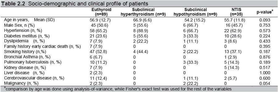 In terms of in-hospital mortality, 9/52 (17.3%) with subclinical thyroid dysfunction died, compared to 8/87 (9.2%) euthyroid patients. The patient with SCT and 2 with SCHO died of cardiac causes. Among those with NTIS, cardiovascular deaths accounted for 4 patients and non-cardiac deaths for 2 patients. The risk of dying among patients with subclinical thyroid dysfunction as opposed to those who were euthyroid was about twice as high (RR=1.86). The risk was highest among SCHO patients (RR=2.47) (Table 4.1 and 4.2).