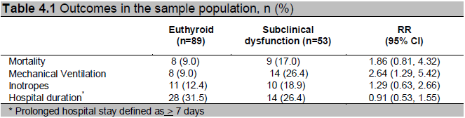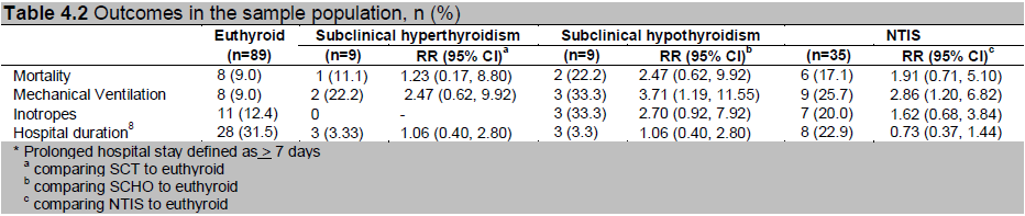 Methodology.163 adult cardiac patients were screened for subclinical thyroid dysfunction, [subclinical hyperthyroidism (SCT), subclinical hypothyroidism (SCHO), non-thyroidal illness syndrome (NTIS)]. Demographic and clinical characteristics were analyzed using ANOVA and Fisher’s exact test. Outcome considered were hospital duration, need for mechanical ventilation, inotropic support and mortality. Crude association between subclinical thyroid dysfunction and outcomes was evaluated using relative risk.