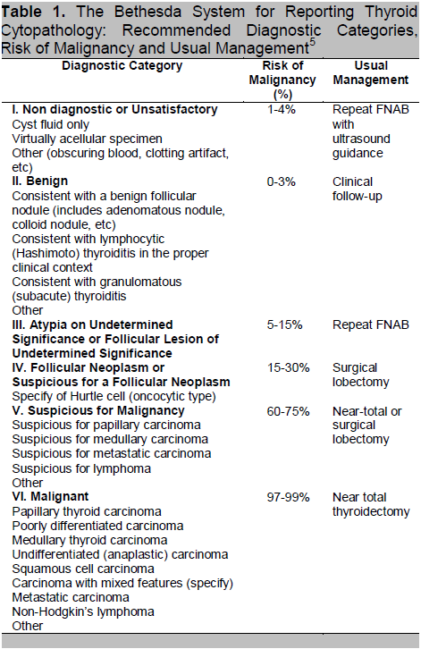 Table 1. The Bethesda System for Reporting Thyroid Cytopathology: Recommended Diagnostic Categories, Risk of Malignancy and Usual Management 5