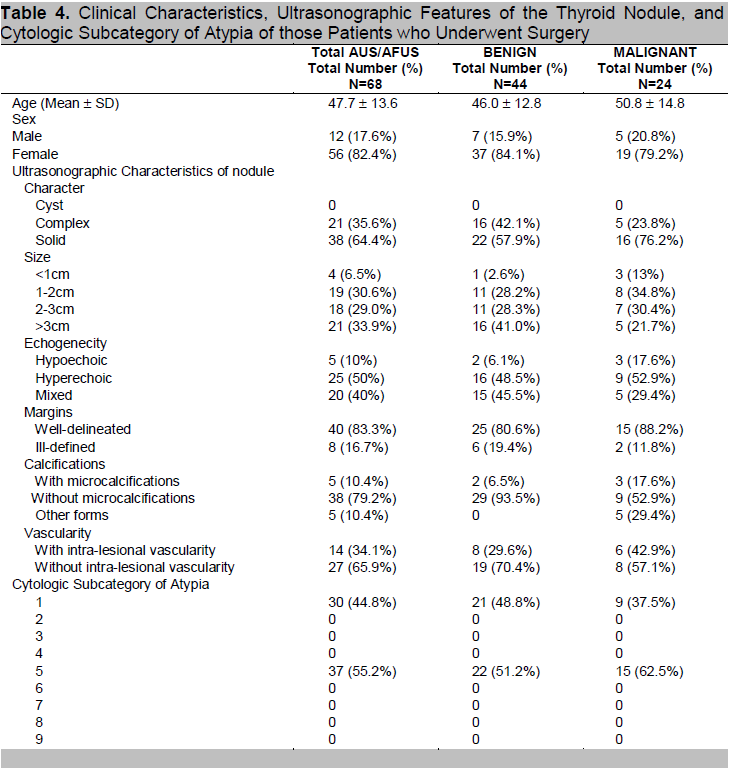 Table 4. Clinical Characteristics, Ultrasonographic Features of the Thyroid Nodule, and Cytologic Subcategory of Atypia of those Patients who Underwent Surgery