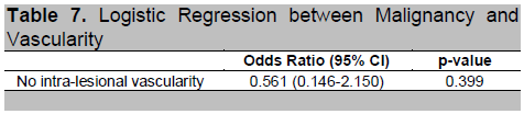 Table 7. Logistic Regression between Malignancy and Vascularity