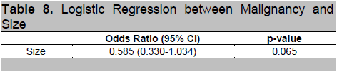 Table 8. Logistic Regression between Malignancy and Size