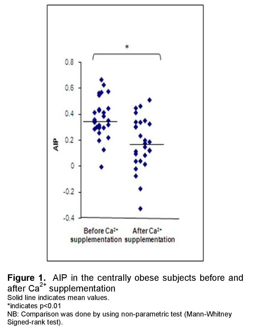 Methodology. This study was undertaken in 28 centrally obese male subjects [age 26.4 (6.5) years], BMI 31.6 (4.7) kg/m2, WC 99.4 (6.4) cm. All participants received six tablets of CaCO3 (250 mg of elemental calcium/ capsule, for a total of 1500 md/day) for 8 weeks. Serum lipid profile including triglyceride, total cholesterol, HDL-C, LDL- C was measured at baseline and after intervention. AIP was calculated by using formula = log (TG/HDL-C).