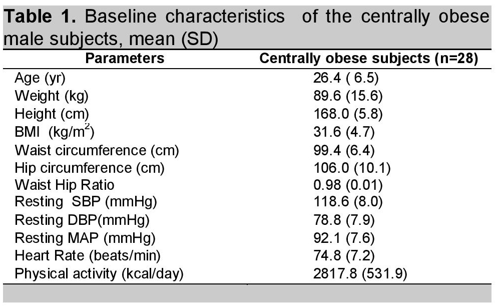 METHODOLOGYApparently healthy centrally obese male subjects (WC > 90 cm), aged between 18-35 years without family history of diabetes mellitus and hypertension (blood pressure >140/90 mmHg), history of regular exercise, chronic smoking and alcohol drinking were recruited to this study. No one was taking medications such as calcium supplements, non-steroidal anti-inflammatory, antihypertensive medications, lipid-lowering drugs, diuretics, or any other drug that affects the lipid metabolism for at least 6 months.