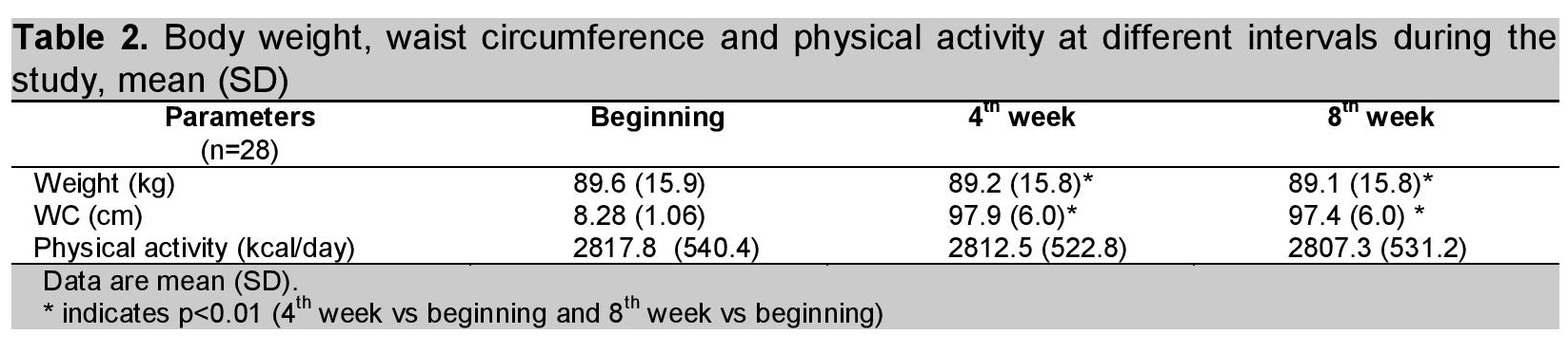 A total of 35 subjects participated in this study. Of these, four were dropped out due to incomplete data, three subjects who did not follow the instructions were also excluded from the study. Only 28 subjects remained in this study. Table 1 shows the baseline characteristics of subjects who participated in this study. Body weight, WC and measurement of physical activity was done at the beginning, at the 4th week and at the end of the 8th week of the study period. Although there was a slight decrease in body weight and WC (0.03% and 2% respectively) at the 8th week of calcium supplementation, it was statistically but not clinically significant. (Table 2). Physical activity was the same during the experimental period.