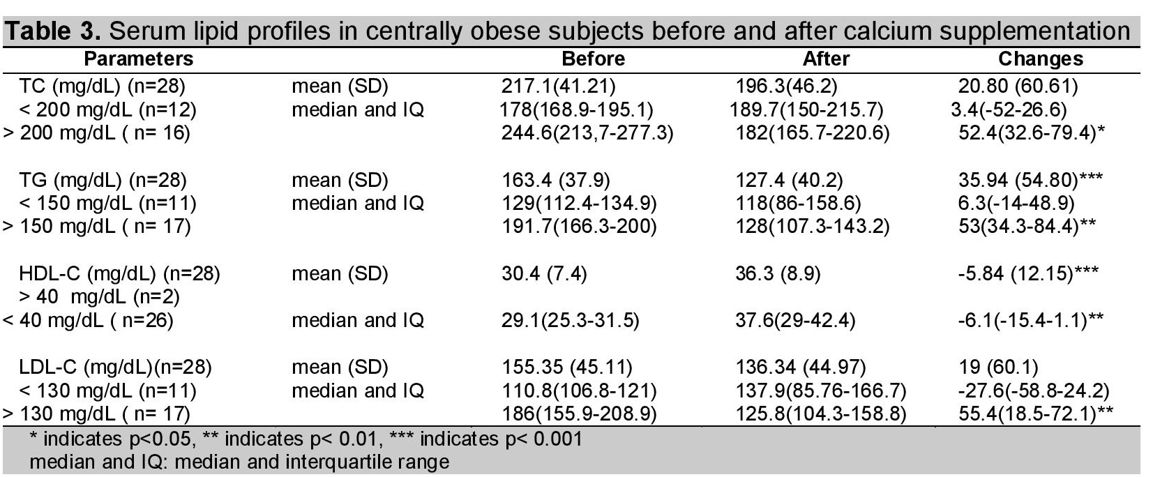 Table 3. Serum lipid profiles in centrally obese subjects before and after calcium supplementation