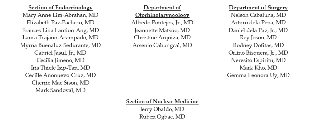In an endeavor to standardize and optimize treatment offered to adult patients with well-differentiated thyroid cancer, endocrinologists, surgeons, otorhinolaryngologists, and nuclear medicine physicians at the UP-PGH met together in 2005 to formulate a practice guideline. After a long process of formulating objectives, presenting respective section protocols, identifying issues, retrieving and reviewing evidence, and finally trying to arrive at a consensus, a clinical practice guideline (CPG) for the management of UP – PGH patients with thyroid nodules and well differentiated thyroid cancer has been drafted and subsequently published in 2008.1