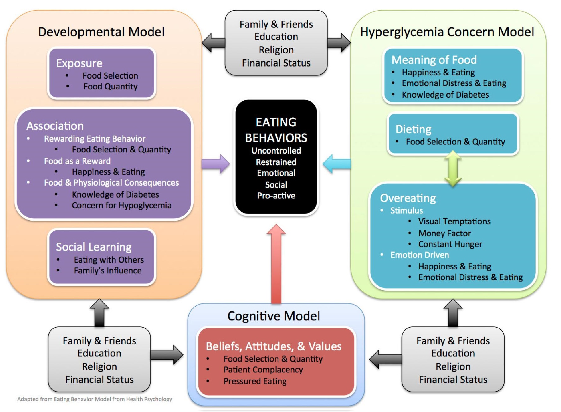 The overall act of eating not only includes food intake per se, but also eating behavior in relation to preference, selection and consumption of food.4 Aside from behavior, it is also influenced by psychosocial and environmental factors.5-6,11 Savoca et al., in 2001 reported that eating patterns were influenced by participants' knowledge of diabetes management, dietary self-efficacy, social support and time management.5 A similar study from the same authors in 2004 identified food habits like limiting portions and high-sugar foods, meal planning, and carbohydrate/vegetable strategies were all related to lower HbA1c levels.7