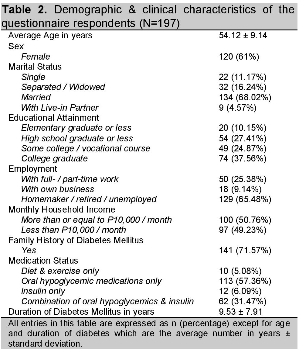 A total of 197 patients were recruited as questionnaire respondents. The study included patients who were 30-65 years of age; able to read, write and understand the Filipino language; diagnosed with type 2 diabetes based on the American Diabetes Association 2013 criteria; with disease duration of at least 6 months; and voluntarily joined the study after signing the informed consent form. All were referred by their physicians from the out-patient clinics of the UP-PGH through convenience sampling. Excluded from this study were patients diagnosed to have type 1 diabetes mellitus, women who were pregnant, and those on drugs which increase blood sugar levels such as steroids, anti-convulsants, atypical anti-psychotics, anti-fungals, sex hormones, anti-retrovirals, octreotide, lamivudine, and levothyroxine.