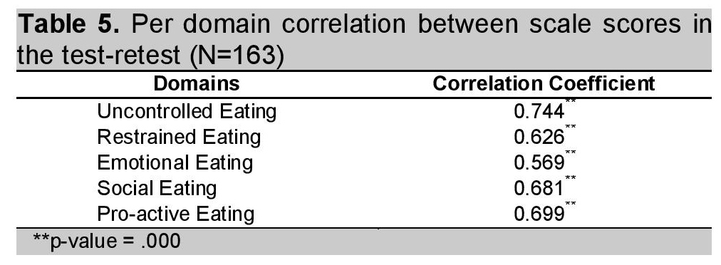 In both first and second testings, only the items in the uncontrolled (Cronbach's α 0.739 & 0.816), social (a 0.641 & 0.707), and pro-active (a 0.622 & 0.665), eating domains were found to be internally consistent.