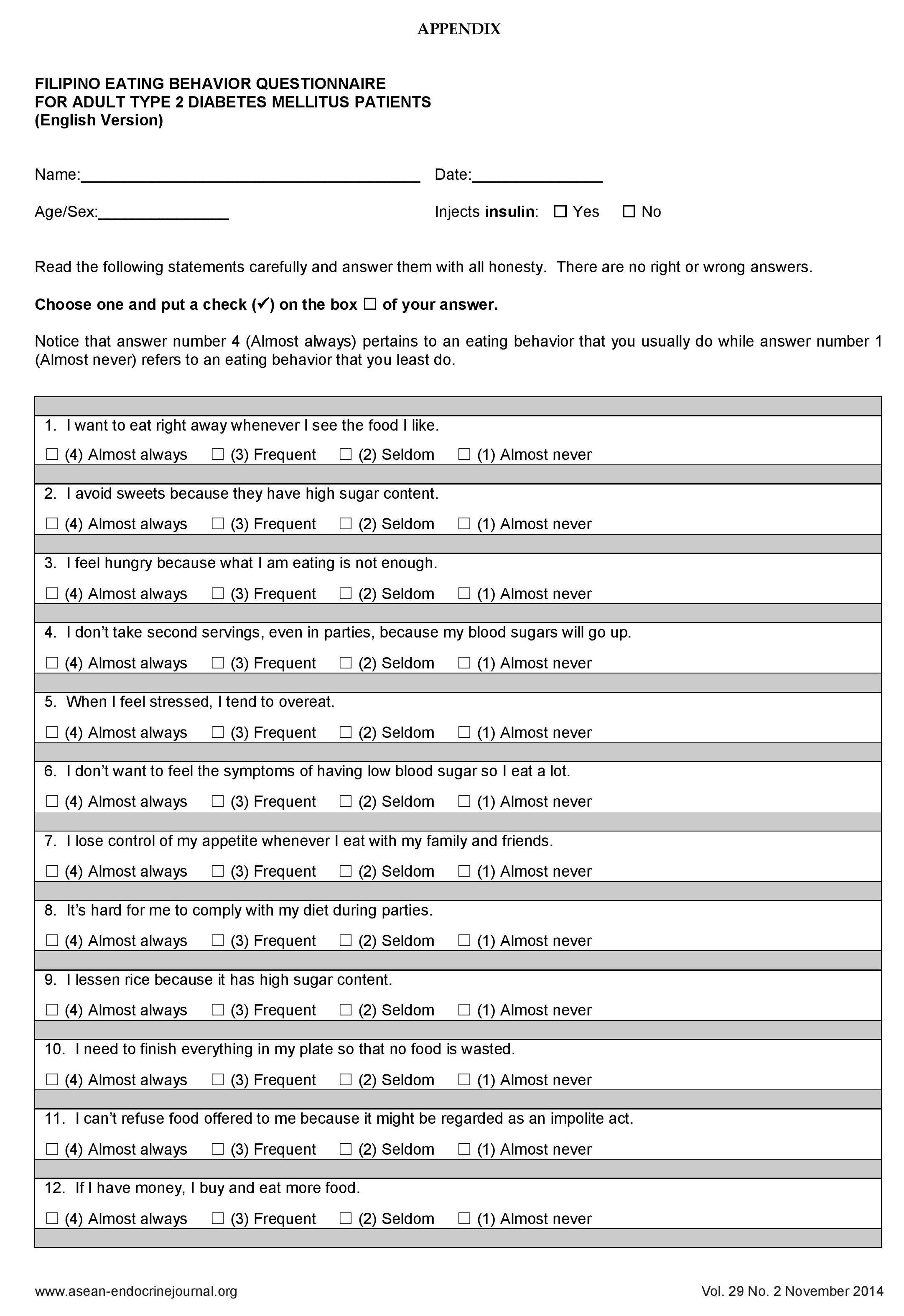 Click here to download Appendix page 1Appendix page 1. FILIPINO EATING BEHAVIOR QUESTIONNAIRE FOR ADULT TYPE 2 DIABETES MELLITUS PATIENTS