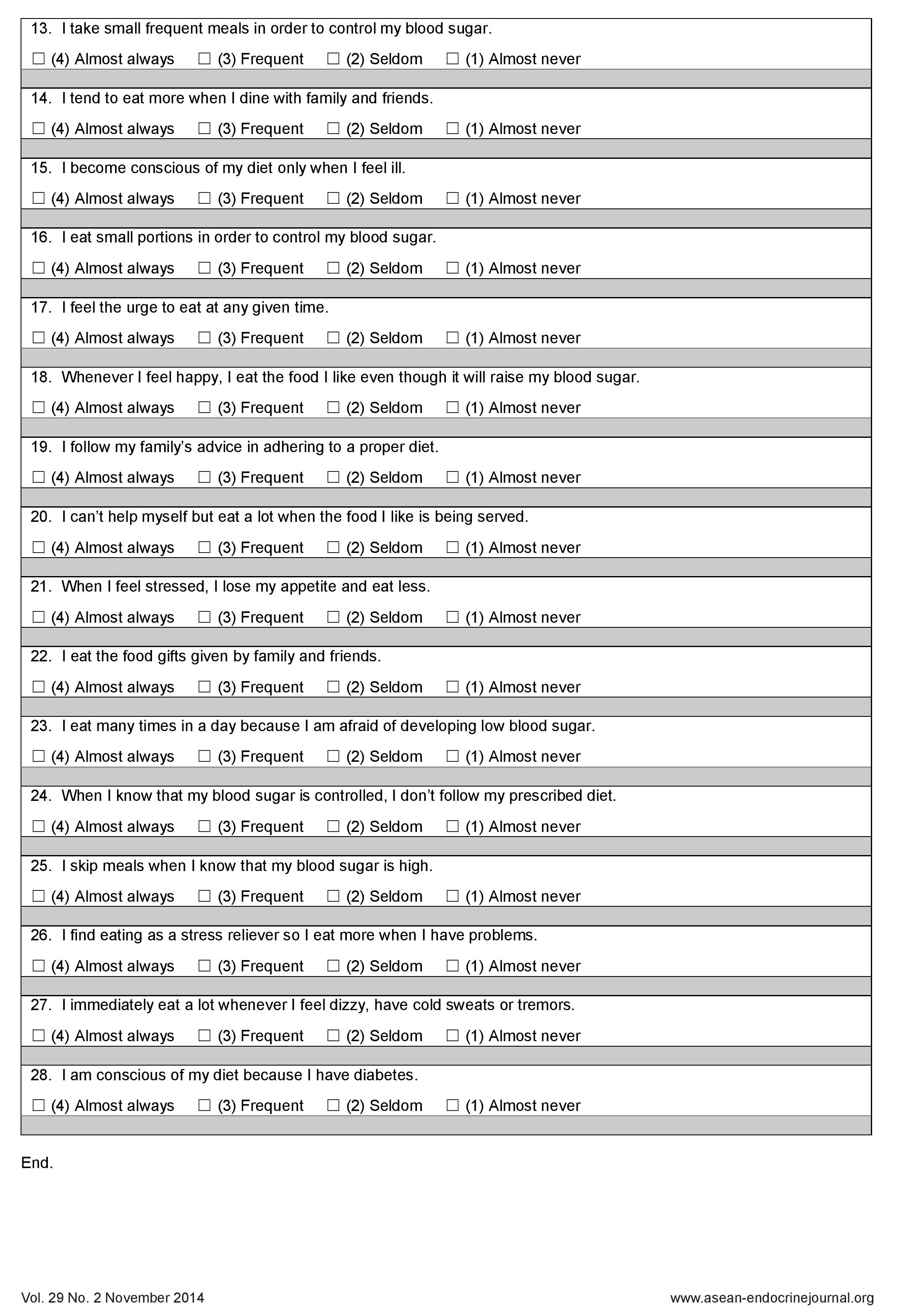The final questionnaire is a 28-item, Filipino eating behavior questionnaire for adults with type 2 diabetes mellitus.