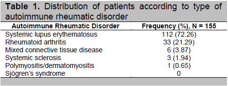 Table 1. Distribution of patients according to type of autoimmune rheumatic disorder