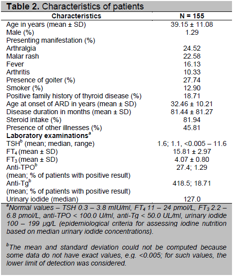 Forty three patients (27.74%) had goiter, 20 patients (12.90%) were either current or previous smokers, and 29 patients (18.71%) had family history of thyroid disease. The mean age at onset of ARD was 32 years old while mean duration of ARD was 81.44 months. One hundred twenty seven (81.94%) of the subjects were on steroids such as prednisone, methylprednisolone, dexamethasone, or hydrocortisone. Seventy one (45.81%) of them had other illnesses like hypertension, dyslipidemia, and diabetes. The mean anti-Tg level was above the normal value while the mean levels of TSH, FT4, FT3, and anti-TPO were within normal. The median UIE corresponded to adequate iodine intake. Characteristics of the patients are summarized in Table 2.