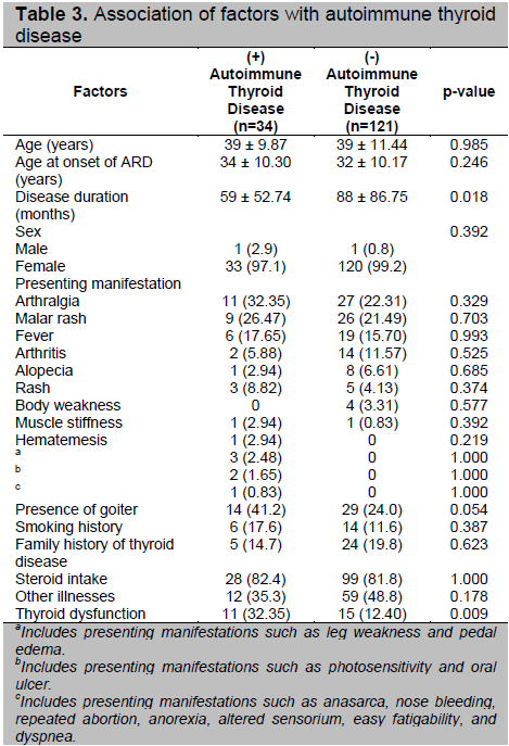 Results. Overall 21.94% of the population had autoimmune thyroid disease. There was significant association between duration of the autoimmune rheumatic disorder and autoimmune thyroid disease (p-= 0.018). No significant association was noted with the other clinical factors although there was an almost significant association observed for the presence of goiter (p=0.054).