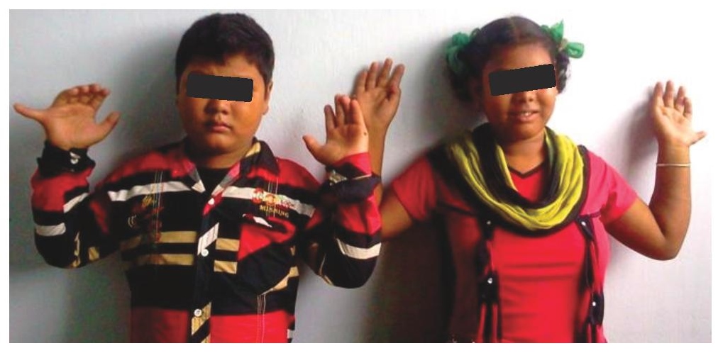 Figure 3. Photograph showing the two overweight siblings (patients B and C) with postaxial polydactyly.