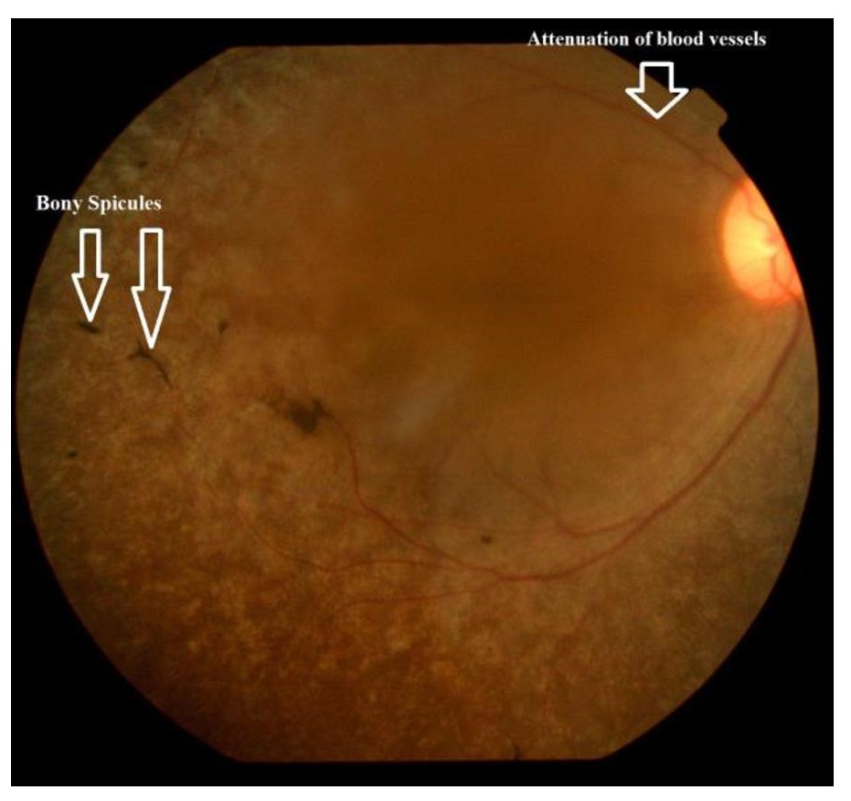 Fundus examination: Patient A: mild pallor of the disc, attenuation of retinal arterioles; cellophane maculopathy; few isolated bony spicules along the seminal blood vessels (fig.4)(Fig.5).