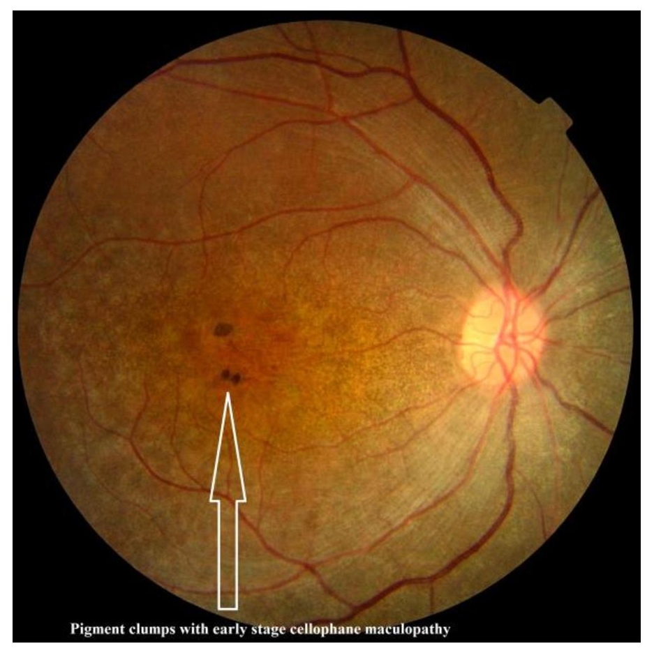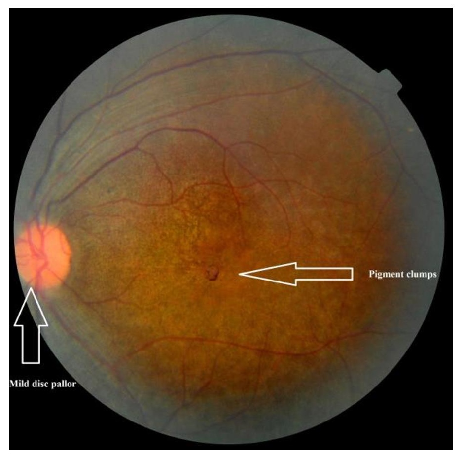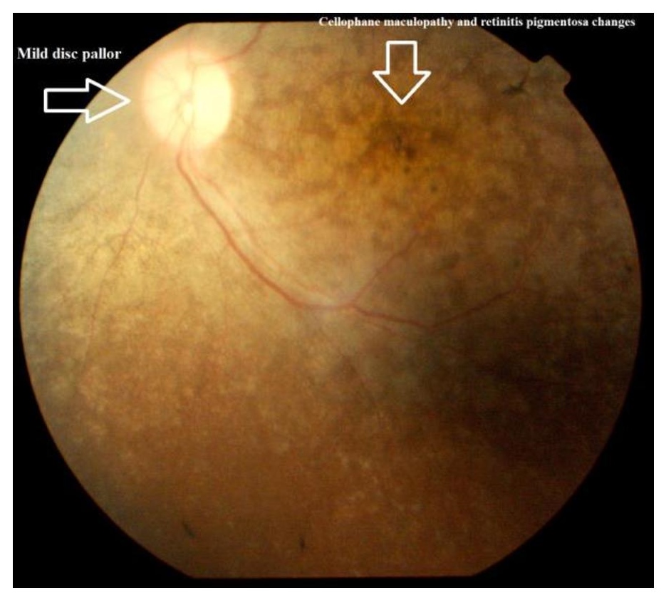 Patient C: mild pallor of the disc; attenuation of retinal arterioles; cellophane maculopathy with pigment clumps around the macula (Fig.8)(Fig.9). Biochemical investigations including correlated hormonal and lipid profile, ultrasound (USG) abdomen and echocardiography were non-contributory. Electroretinography and further investigations were refused by the patients' families.