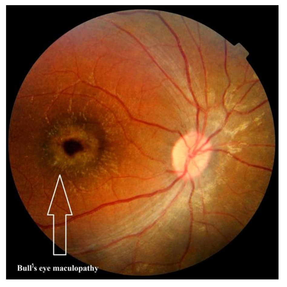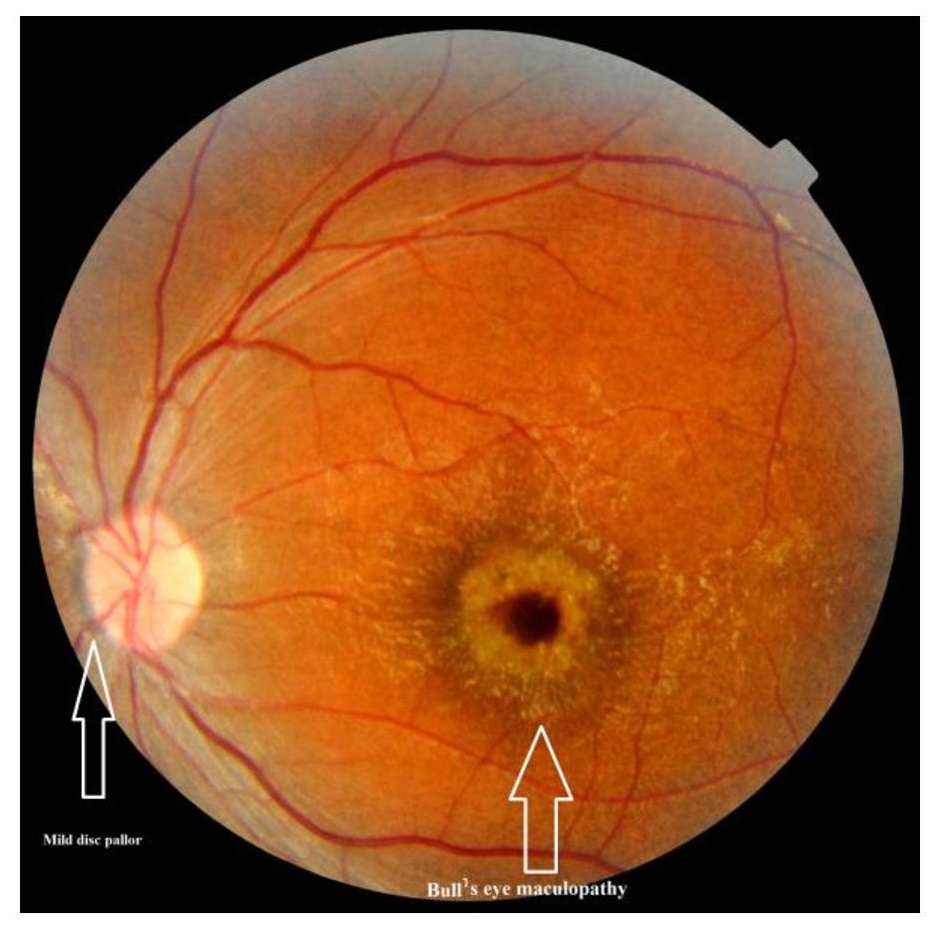 Patient B: mild pallor of the disc; presence of internal limiting membrane folds surrounding the fovea; retinal pigment epithelial atrophy around the foveal and perifoveal zone resembling Bull's eye maculopathy (Fig.6)(Fig.7).