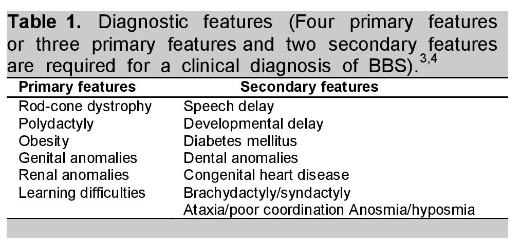 With characteristic clinical features, Bardet-Biedl syndrome (BBS) was diagnosed in our patients as per modified diagnostic criteria by Beales et al., (Table 1)3,4 and other possibilities were ruled out. The inheritance of BBS is usually considered autosomal recessive although this was absent in our first case. The diagnosis can be made based on clinical features and phenotype evolves variably in different patients.