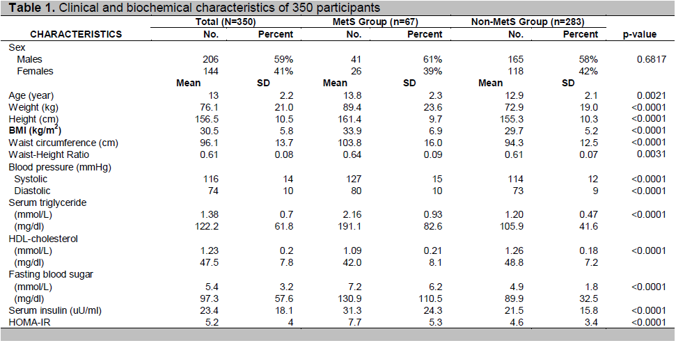 Among 350 participants, 206 (59%) were males and 144 (41%) females; 297 (85%) were obese and 53 (15%) were overweight. The age ranged from 10 to 18.8 years with a mean of 13 ±2.2 years. The BMI ranged from 20 to 51.7, with a mean of 30.5±5.8. There was no sex difference in most of the demographic and laboratory variables, except that males had larger waist circumference (p= 0.0004), waist-height ratio (p= 0.0009) and higher mean systolic BP (p= 0.0168).The clinical and biochemical characteristics of participants categorized by MetS were shown in Table 1.