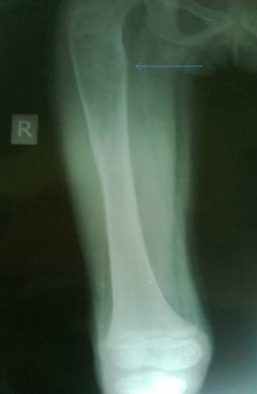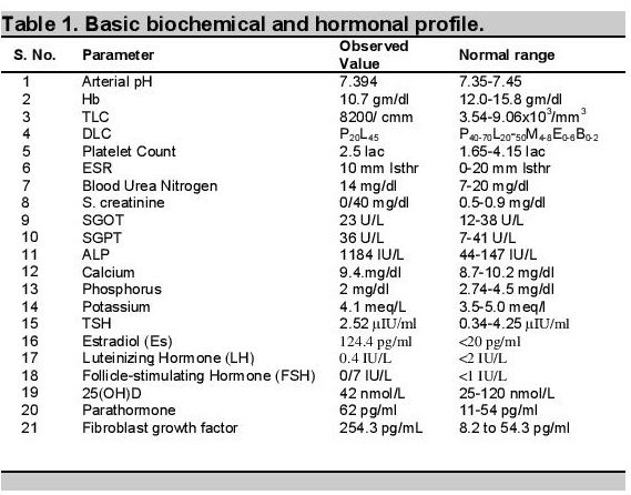 Other investigations revealed normal serum calcium (9.4 mg/dL), phosphorus was reduced to 2 mg/dL (normal 2.7-4.5 mg/dL), markedly elevated serum alkaline phosphatase 1184 IU/L (normal 145-420 U/L), normal potassium (4.1 meq/L), normal 25(OH),D level of 42 nmol/L (25-120 nmol/L). Parathormone level was mildly elevated at 62 pg/ml (normal 11 - 54 pg/ml), fibroblast growth factor (FGF-23): 254.3 RU/mL.