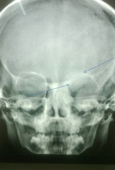 X-ray of the lower limbs showed fibrous dysplasia involving the left femur [Figure 2] and skull x-ray showed ground glass appearance of the left orbit. [Figure 3]