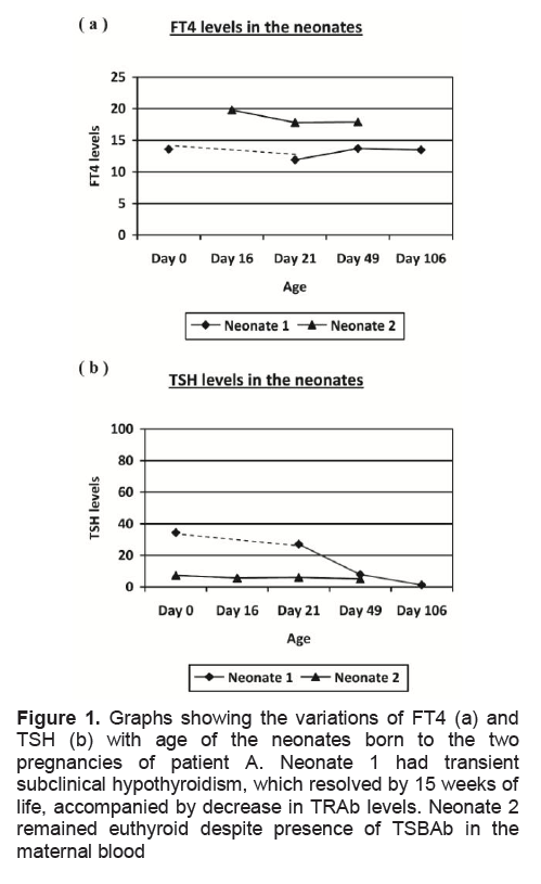 Figure 1. Graphs showing the variations of FT4 (a) and TSH (b) with age of the neonates born to the two pregnancies of patient A. Neonate 1 had transient subclinical hypothyroidism, which resolved by 15 weeks of life, accompanied by decrease in TRAb levels. Neonate 2 remained euthyroid despite presence of TSBAb in the maternal blood