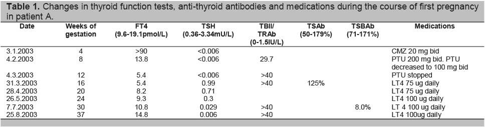 Table 1. Changes in thyroid function tests, anti-thyroid antibodies and medications during the course of first pregnancy in patient A.