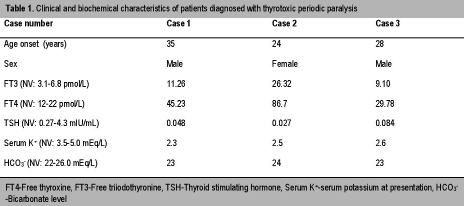 Click here to download Table 1Table 1. Clinical and biochemical characteristics of patients diagnosed with thyrotoxic periodic paralysis