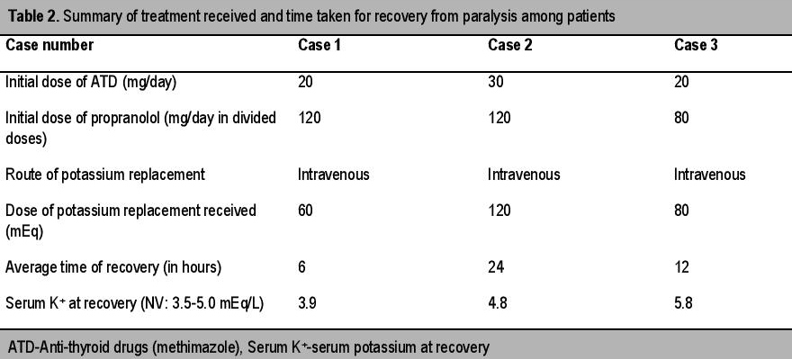 A 35-year-old man presented to the emergency department with complaint of generalized weakness of all four limbs. No precipitating factors could be identified on enquiry.There was history of similar attacks, occuring thrice in the past six months but it resolved on its own within a few hours and he was never hospitalized. The weakness appeared at night time. The patient had no history of fever, diarrheal episode, palpitation, nervousness or weight loss. There was no history of similar attack in his family members. On examination, the patient was conscious, oriented and afebrile. The pulse rate was 104/minute and blood pressure was 130/80 mm Hg. Neck examination revealed a small, diffuse, non-tender, grade 1 goiter without any bruit. He had no cranial nerve deficit. The motor power was grade 2/5 in all four limbs and deep tendon reflexes (DTRs) were slightly depressed. There was no sensory or bladder involvement. No thyroid-associated ophthalmopathy or dermopathy was detected. Electrocardiogram (ECG) revealed sinus tachycardia and presence of U waves in leads v2 to v4. Important biochemical investigations and thyroid function tests are summarized in Table 1. Renal function tests, liver function tests and glycemic status were normal. Based on above findings, a diagnosis of TPP was made. He was given intravenous potassium solution (potassium chloride), beta blockers (propranolol) and ATD (methimazole) (Table 2). He made an uneventful recovery from paralysis within six hours. Subsequently, nerve conduction study (NCS) and electromyography (EMG) were done which revealed no abnormality. Ultrasonography (USG) of the thyroid gland revealed diffuse enlarged thyroid gland with increased vascularity. Technetium 99m scan (Tc 99 m scan) was done later on and it showed a hyperfunctioning gland with increased diffuse tracer uptake. During a nine-month follow-up period, the patient was euthyroid with anti-thyroid medications and was free from any paralytic attack.