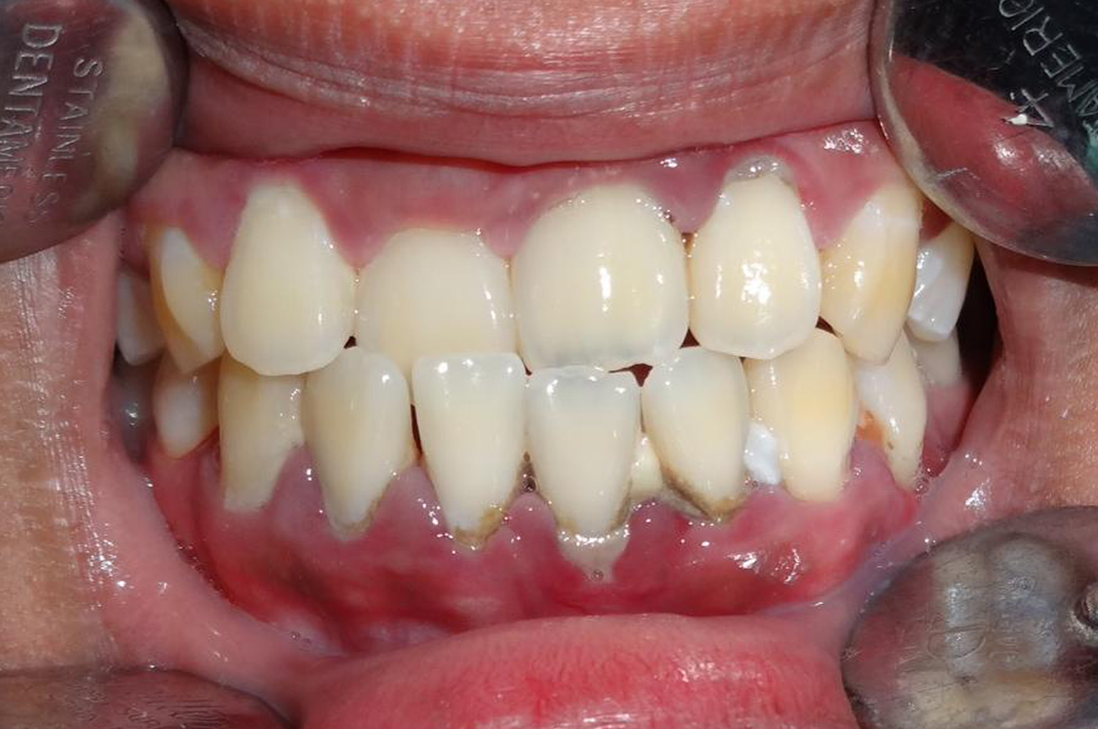 Figure 3.Periodontitis with heavy calcular deposits that extends to the subgingival area with Inflamed gingiva that easily bleeds.