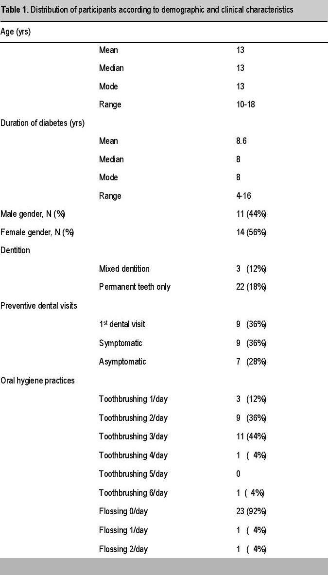 Patient profile. A total of 25 type 1 diabetic patients attended the camp. Of these, 14 (56%) were female while 11 (44%) were male. Mean age of the participants was 13 and a mean number of years with diabetes of 8.6. Three (12%) of the patients still had deciduous teeth. Nine (36%) had their first dental examination during the camp, while another 9 (36%) visited their dentist regularly twice a year. The rest, 7 (28%), went to their dentists only when they felt they had problems. Twenty two patients (88%) brushed their teeth at least twice a day and 23 (92%) did not use the dental floss (Table 1).